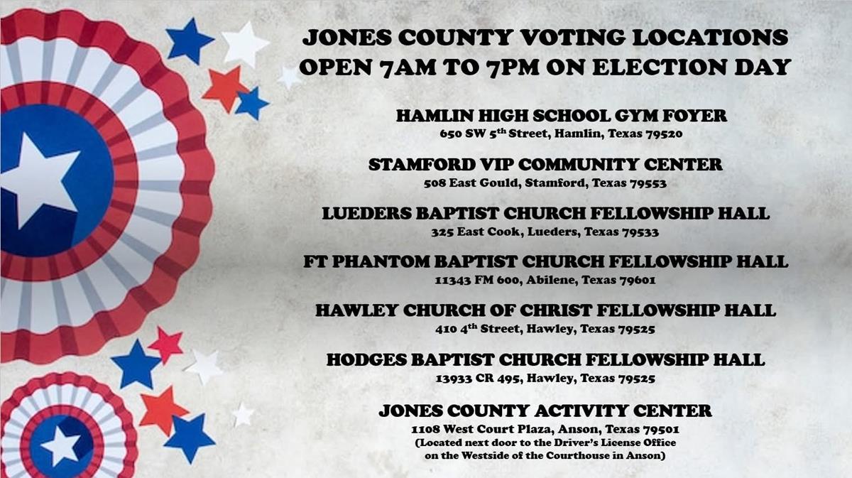 2020 NOVEMBER ELECTION INFORMATION Anson ISD Sample Ballot City of Abilene Sample Ballot City of Anson Sample Ballot City of Hawley Sample Ballot City of Stamford Sample Ballot Jones County Sample Ballot Lueders Avoca ISD Sample Ballot Merkel ISD Sample Ballot Roby CISD Sample Ballot Stamford Hospital District Sample Ballot Stamford Hospital District - Notice of Election for November 3, 2020 Roby CISD - Notice of Election for November 3, 2020 Important Election Dates for November 2020 - Notice of Election & List of Candidates Order of Election - November 3, 2020